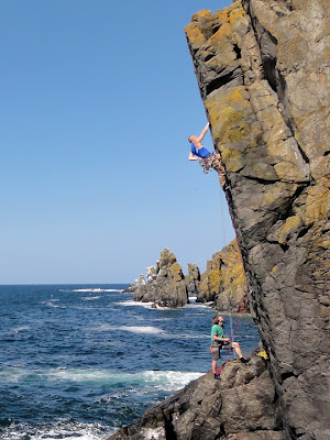 Arbroath - met "From The Anti-Headpoint Consortium: Ross", now escaped to Perth. Apparently the Consortium was just Dan's joke on Consumed and there's no ID cards, t-shirts, secret handshakes or anything. Another childhood dream RUINED. Anyway did a couple of cool steep routes on Granny's Garrett and watched Ross on a DWS project hidden in plain view beneath it. The sea claimed him before the project did. I wussed out and stayed dry.